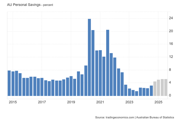 - The household savings rate rose to 3.2% in the September quarter of 2024, up from previous lows. Historically, personal savings in Australia have averaged 9.28% since 1959, with peaks during the pandemic (23.9% in Q2 2020) and lows in 2006 (-2.4%).