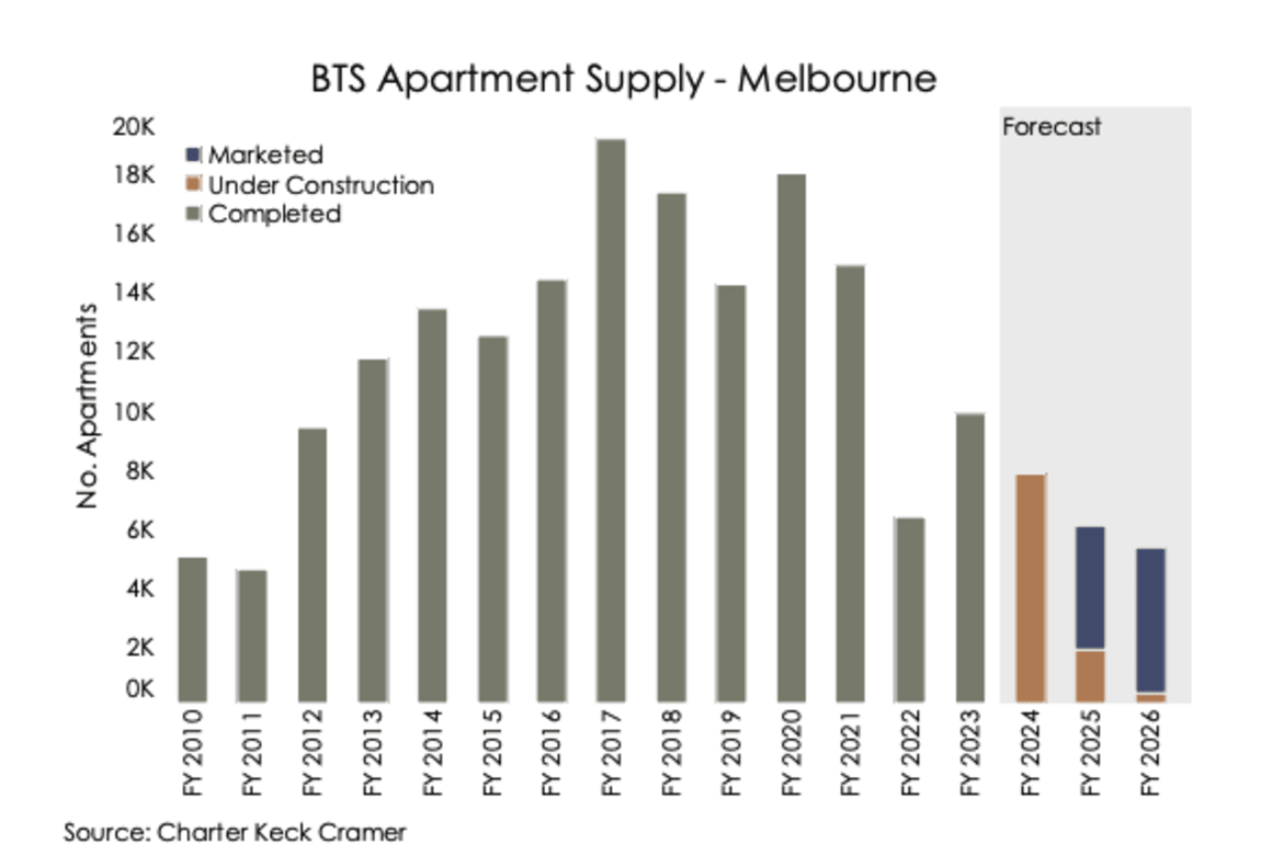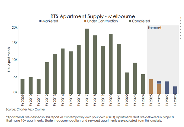 Apartment completions in Melbourne are very low by historic standards. At approximately 5,900 units, new apartment supply was at its lowest level for 13 years. New apartment supply is expected to fall further over the coming years, with just 4,000 apartments per annum currently projected by Charter Keck Cramer to be delivered for the next three years. This will be the lowest period of new supply recorded in Melbourne since 2009.