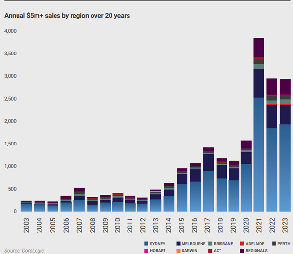 According to CoreLogic, the year ending 31 December 2023 recorded 2,927 sales at $5 million or more, representing a 0.5% decrease compared to 2022 and a 23.9% decline from the 2021 peak, which saw a record 3,845 transactions in this price range.