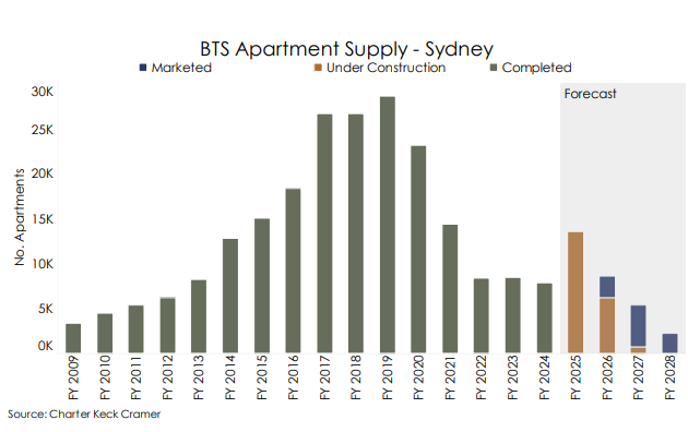 Apartment completions in Sydney were historically low in 2024. At only 7,800 completions, new apartment supply was considerably below its historic average for the third consecutive year and the lowest for 12 years. Despite the projected uptick in supply in 2025, Charter Keck Cramer’s view is that the market will remain chronically under-supplied due to subdued completions over recent years and, looking forward, the growing population will absorb new supply more quickly than it can be built.