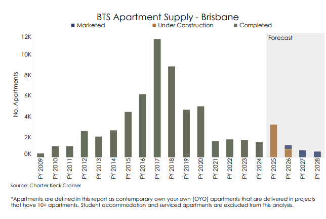 Apartment completions in Brisbane are extremely low by historic standards. At just 1,540 completions, new apartment supply represented just a third of typical annual completions. Supply is expected to increase over the next 12 months, with 3,200 apartments under construction and due for 2025. Notwithstanding the expected 2025 increase, Charter Keck Cramer’s view is that the market will remain chronically under-supplied. Overall, the new apartment supply over the next 2-3 years is expected to remain very low.