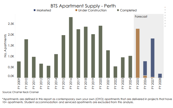 For the fourth consecutive year, apartment completions were below average in Perth, reaching just 1,000 completions in 2024. Supply is expected to see a significant rebound over the next 12 months, with 2,300 apartments under construction and due for 2025 completion. Despite the projected uptick in supply for 2025 and 2026, Charter Keck Cramer’s view is that the Perth apartment market will remain under-supplied.