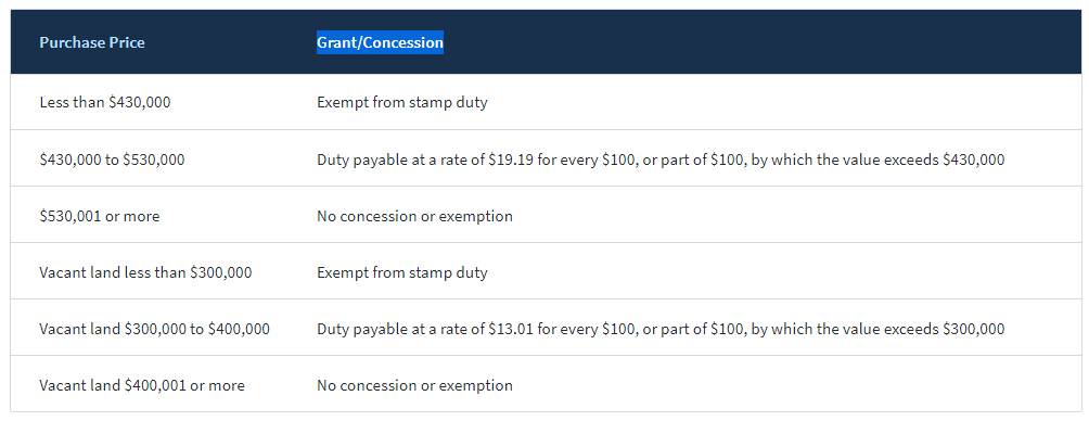Yes, the First Home Owner Rate of Duty provides exemptions and concessions when purchasing homes valued at less than $530,000 and vacant land less than $400,000.