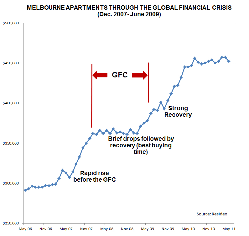 An analysis of prices of Melbourne apartments during the Global Financial Crisis (GFC) - the last time we saw serious pressure on the economy and prices - should be examined, to see what happened then.