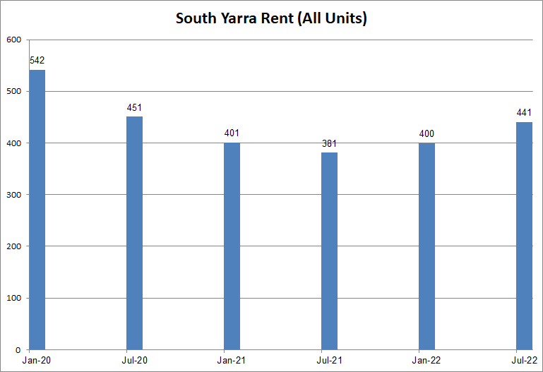 Rents in South Yarra FELL by 29% from January 2020 to July 2021. Since then they have recovered by 16%, but have not yet recovered fully. With the shortage of construction and things returning to normal, rents will continue to rise.