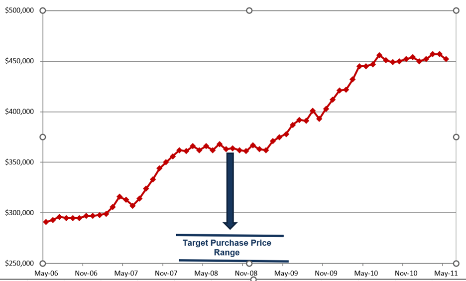 If you had used our strategy at that time, that is trying to secure units 40% to 50% below the median price, you would be looking at a target price similar to that shown below.